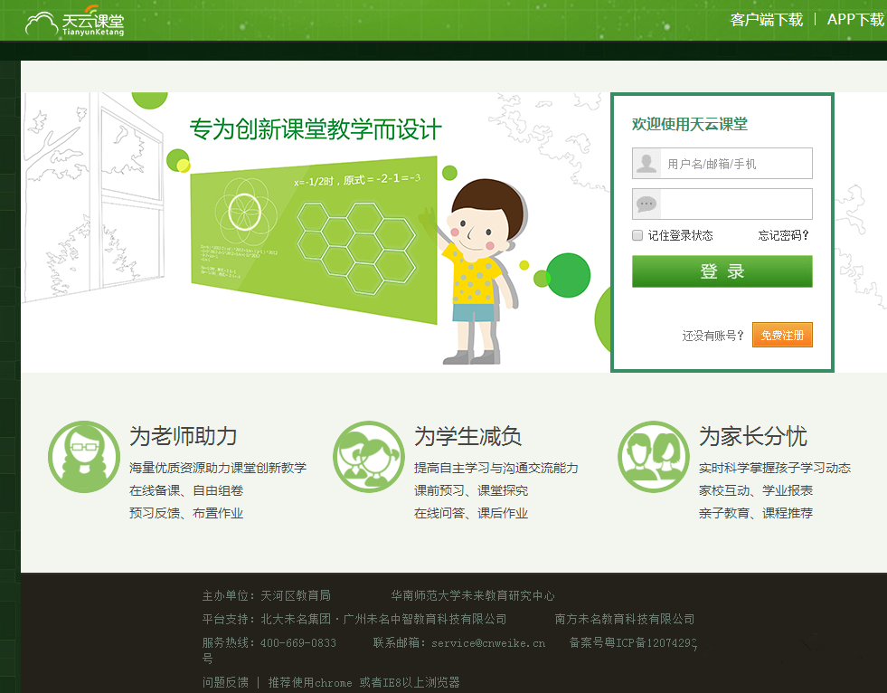 注:天云课堂教学平台(http://tianyun.cnweike.cn)是广州市天河区教育局创新教学专用平台,由北大未名中智教育科技支持,在实践教学应用中经过两年多不断的技术改造和升级,目前已攻克了多项技术难题,开发并优化了多个教学实用性较强的教学功能,具备稳定地为天河区各中小学校提供教育教学服务的能力。该平台具有海量优质教学资源(微课100000余节/习题5000000道/课件、教案、学案每天更新……),满足教师教学资源搜集与管理、快速组卷、智能备课、互动上课、在线布置/检查作业、学情跟踪与分析、家校互动交流等核心教学需求。根据天河区教育局教育信息中心信息化教学建设体系的整体部署,天云课堂平台目前已经纳入“广州数字教育城”,与之进行了数据对接、一站式登录。
